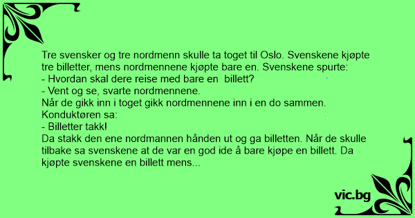 Tre svensker og tre nordmenn skulle ta toget til Oslo. Svenskene kjøpte tre billetter, mens nordmennene kjøpte bare en. Svenskene spurte: