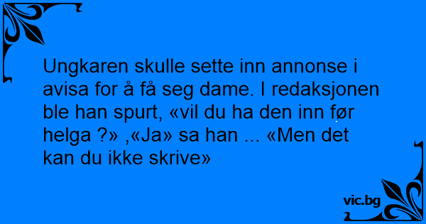 Ungkaren skulle sette inn annonse i avisa for å få seg dame. I redaksjonen ble han spurt, «vil du ha den inn før helga ?» ,«Ja» sa han ... «Men det kan du ikke skrive»