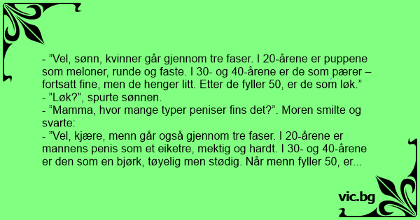 - ”Vel, kjære, menn går også gjennom tre faser. I 20-årene er mannens реnis som et eiketre, mektig og hardt. I 30- og 40-årene er den som en bjørk, tøyelig men stødig. Når menn fyller 50, er реnis mer som et juletre.”