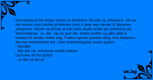 Venneslaruta ble lenge drevet av brødrene Bendik og Johannes. Så var det eleven som hadde problemer med å lære seg navnet til døperen Johannes. Moren sa til han at han bare skulle tenke på Johannes på Venneslaruta. Jo, det var en god ide, tenkte gutten og gikk glad å fornøyd til skolen neste dag. Frøkna spurte ganske riktig hva døperen i det nye testamentet het. Uten betenkningstid svarte gutten.