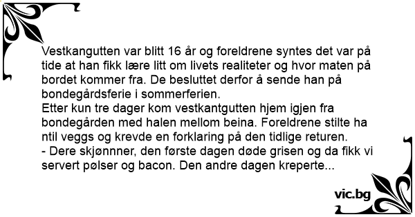 Etter kun tre dager kom vestkantgutten hjem igjen fra bondegården med halen mellom beina. Foreldrene stilte ha ntil veggs og krevde en forklaring på den tidlige returen.