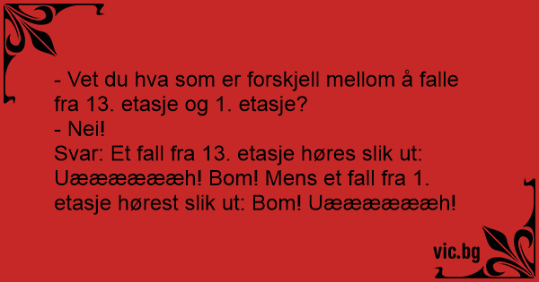 Svar: Et fall fra 13. etasje høres slik ut: Uææææææh! Bom! Mens et fall fra 1. etasje hørest slik ut: Bom! Uææææææh!