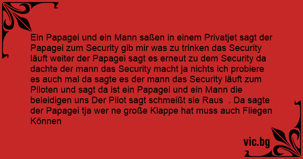 Ein Papagei und ein Mann saßen in einem Privatjet sagt der Papagei zum Security gib mir was zu trinken das Security läuft weiter der Papagei sagt es erneut zu dem Security da dachte der mann das Security macht ja nichts ich probiere es auch mal da sagte es der mann das Security läuft zum Piloten und sagt da ist ein Papagei und ein Mann die beleidigen uns Der Pilot sagt schmeißt sie Raus . Da sagte der Papagei tja wer ne große Klappe hat muss auch Fliegen Können