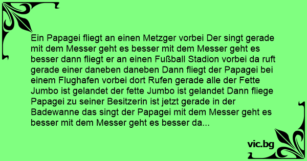 Ein Papagei fliegt an einen Metzger vorbei Der singt gerade mit dem Messer geht es besser mit dem Messer geht es besser dann fliegt er an einen Fußball Stadion vorbei da ruft gerade einer daneben daneben Dann fliegt der Papagei bei einem Flughafen vorbei dort Rufen gerade alle der Fette Jumbo ist gelandet der fette Jumbo ist gelandet Dann fliege Papagei zu seiner Besitzerin ist jetzt gerade in der Badewanne das singt der Papagei mit dem Messer geht es besser mit dem Messer geht es besser da wirft die Besitzerin die Seife nach ihm er weicht Der Seife aus und ruft daneben daneben dann steigt die Besitzerin aus der Badewanne und rutscht auf der Seife aus da ruft der Papagei der Der fette Jumbo ist gelandet