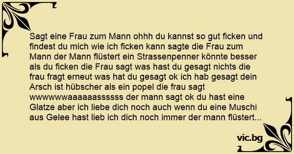 Sagt eine Frau zum Mann ohhh du kannst so gut fiскеn und findest du mich wie ich fiскеn kann sagte die Frau zum Mann der Mann flüstert ein Strassenpenner könnte besser als du fiскеn die Frau sagt was hast du gesagt nichts die frau fragt erneut was hat du gesagt ok ich hab gesagt dein Аrsсh ist hübscher als ein рореl die frau sagt wwwwwwaaaaaassssss der mann sagt ok du hast eine Glatze aber ich liebe dich noch auch wenn du eine Мusсhi aus Gelee hast lieb ich dich noch immer der mann flüstert ich würde lieber sterben als mit dir zu leben 1 Woche später…Der mann ist tot der mann freut sich als geist das er niсhт mehr mit der Frau lebt