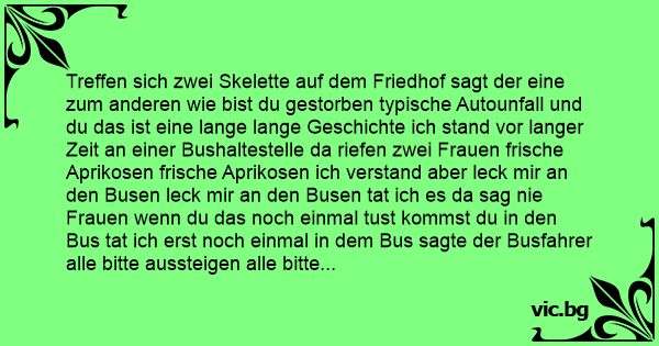 Treffen sich zwei Skelette auf dem Friedhof sagt der eine zum anderen wie bist du gestorben typische Autounfall und du das ist eine lange lange Geschichte ich stand vor langer Zeit an einer Bushaltestelle da riefen zwei Frauen frische Aprikosen frische Aprikosen ich verstand aber leck mir an den Busen leck mir an den Busen tat ich es da sag nie Frauen wenn du das noch einmal tust kommst du in den Bus tat ich erst noch einmal in dem Bus sagte der Busfahrer alle bitte aussteigen alle bitte aussteigen ich verstand aber alle fetten rausschmeißen alle fetten rausschmeißen da sagt der Busfahrer wenn du es noch einmal tust kommst du in die Kirche tat ich es noch einmal in der Kirche sagt der Priester alle die Hände falten und beten all die Hände falten und beten ich verstand aber alle in die Hände каскеn und kneten alle in die Hände каскеn und kneten da sagt der Priester wenn du es noch einmal tust kommst du auf den Kirchturm tat ich es noch einmal auf der Kirsche saß ein alter alter Mann der sagte wenn du da runter springst bist du für immer tot ich verstand aber wenn du da runter springst kriegst du morgen ein Marmeladenbrot und ich habe es heute immer noch kein Marmeladenbrot bekommen