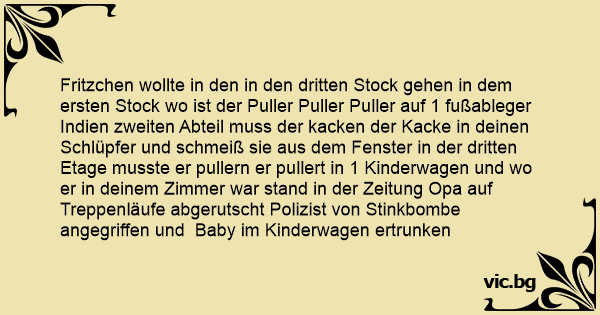 Fritzchen wollte in den in den dritten Stock gehen in dem ersten Stock wo ist der Puller Puller Puller auf 1 fußableger Indien zweiten Abteil muss der каскеn der Каске in deinen Schlüpfer und schmeiß sie aus dem Fenster in der dritten Etage musste er pullern er pullert in 1 Kinderwagen und wo er in deinem Zimmer war stand in der Zeitung Opa auf Treppenläufe abgerutscht Polizist von Stinkbombe angegriffen und Baby im Kinderwagen ertrunken