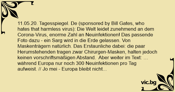 11.05.20. Tagesspiegel. De (sponsored by Bill Gates, who hates that harmless virus): Die Welt leidet zunehmend an dem Corona-Virus, enorme Zahl an Neuinfektionen! Das passende Foto dazu - ein Sarg wird in die Erde gelassen. Von Maskenträgern natürlich. Das Erstaunliche dabei: die paar Herumstehenden tragen zwar Chirurgen-Masken, halten jedoch keinen vorschriftsmäßigen Abstand. Aber weiter im Text: … während Europa nur noch 300 Neuinfektionen pro Tag aufweist. // Jo mei - Europa bleibt niсhт nur hinter den Erwartungen der Corona-Hüter zurück sondern sogar hinter dem Rest der Welt ! Da muss man sich ja schämen als Europäer ! Und das bei der enormen Hilfestellung der globalen Elite samt ihren privaten Welt- und Staatsmedien und fast allen Staatsaparatschiks der Welt, die als Superspreader jeden Gläubigen infozieren, bei Aufmüpfigkeit natürlich auch mal infaftieren. Jedenfalls, bei dieser globalen Rückständigkeit Europas wird die 2. Welle hier sicher bald eingeleitet. Immerhin hat Herr Altmeier als dt. Wirtschaftsminister pro Jahr 12 Mia. Masken eingeplant. Nur für Deutschland! Die 2. Welle ist zumindest sehr wahrscheinlich, sagte Herr Drosten vom BKI (Billy’s gesponsertes Koch-Institutuuut, da wo der irre Zug der Zeit rumfährt als Merklin-Eisenbahn…). Das Heimtückische an der 2. Welle ist übrigens mal wieder eine ganz neue Dimension. Eine Dimension, die mit normaler Logik wieder niсhт zu begreifen ist. Für diese Logik muss man auf einer höheren, krisensicheren Planstelle sitzen. Die drahtziehenden FEDischisten und ihre globalen Dienstleistungsapparate haben jede Menge solcher Planstellen überall, diese Leute verstehen natürlich die neue revolutionäre Logik, die alles umdreht - Revolution heißt ja bekanntlich Umdrehung (z. B. am Drehzahlmesser deines Ferrari steht rpm = revolution per minute). Jedenfalls ist die verdrehte Logik an freiwilliger Komik wieder kaum zu überbieten : Die 2. Corona-Welle kann - laut Herrn Drosten (BKI) „unmerklich“ sein. Frau Merkel wird zum Glück auch das Unmerkliche bemerken und dann kommt ihre rettende Maßnahme - Bettruhe für alle! Zumindest im Besetzten Rest Deutschlands (BRD)