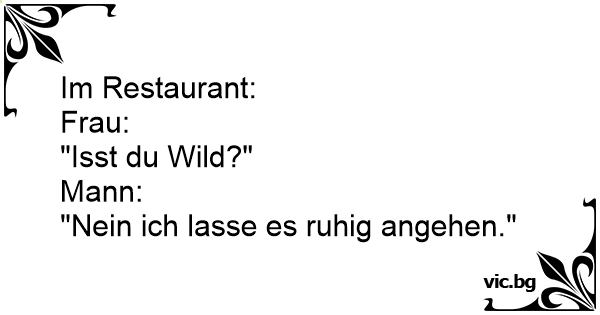 Im Restaurant:<br />Frau:<br />"Isst du Wild?"<br />Mann:<br />"Nein ich lasse es ruhig angehen."