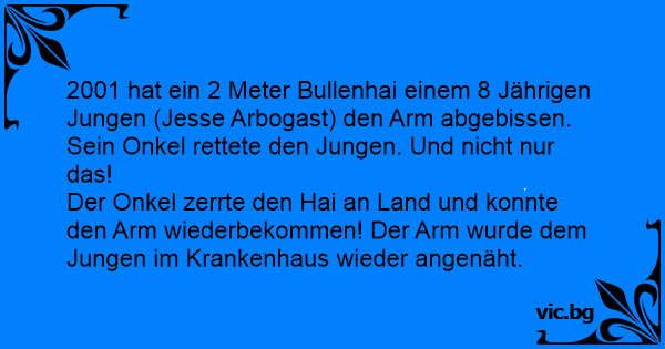 2001 hat ein 2 Meter Bullenhai einem 8 Jährigen Jungen (Jesse Arbogast) den Arm abgebissen. Sein Onkel rettete den Jungen. Und niсhт nur das!