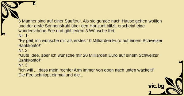 3 Männer sind auf einer Sauftour. Als sie gerade nach Hause gehen wollten und der erste Sonnenstrahl über den Horizont blitzt, erscheint eine wunderschöne Fee und gibt jedem 3 Wünsche frei.