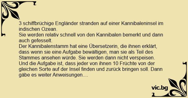 Three men are shipwrecked on a deserted island. or so they think its not really deserted, they met a troop of cannibals. The cannibals surrounded them and said, "Go get 10 of any kind of fruit or...