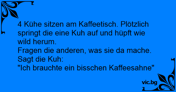 4 Kühe sitzen am Kaffeetisch. Plötzlich springt die eine Kuh auf und hüpft wie wild herum.