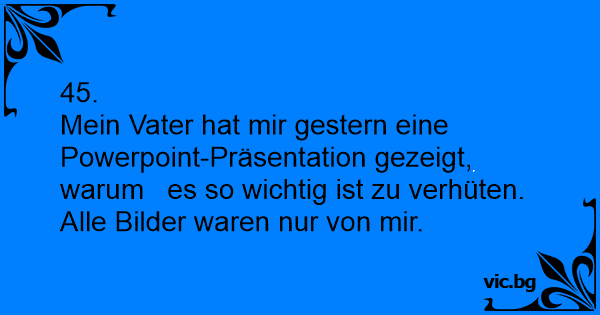 Mein Vater hat mir gestern eine Powerpoint-Präsentation gezeigt, warum es so wichtig ist zu verhüten. Alle Bilder waren nur von mir.