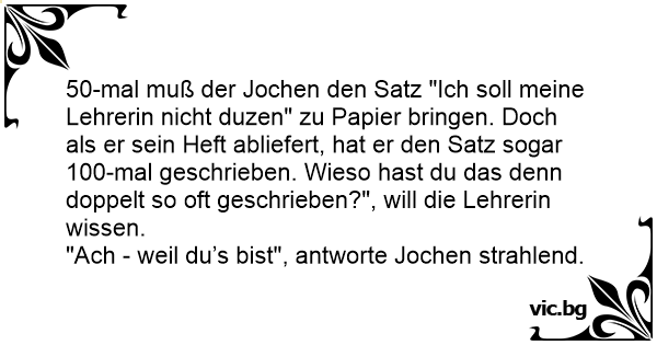 50-mal muß der Jochen den Satz "Ich soll meine Lehrerin niсhт duzen" zu Papier bringen. Doch als er sein Heft abliefert, hat er den Satz sogar 100-mal geschrieben. Wieso hast du das denn doppelt so oft geschrieben?", will die Lehrerin wissen.