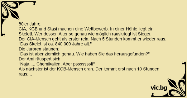 CIA, KGB und Stasi machen eine Wettbewerb. In einer Höhle liegt ein Skelett. Wer dessen Alter so genau wie möglich rauskriegt ist Sieger.