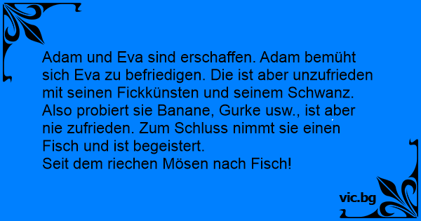 Aatami ja Eeva olivat juuri nussineet, kun Jumala tuli paikalle. - Missä Eeva on, Jumala kysyi. - Joella pesemässä pillua, vastasi Aatami. - Voi vittu, se haju ei lähde kaloista ikinä, huokasi Jumala.