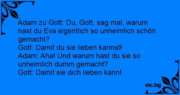 Mann sprach zu Gott: "Gott, warum hast du die Frau so schön gemacht?" Gott sprach: "Damit du sie liebst." "Aber Gott," sprach der Mann, "warum hast du sie so dumm gemacht?" Gott sprach: "Damit sie dich liebt."