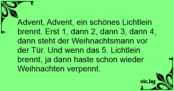 Advent, Advent, ein schönes Lichtlein brennt. Erst 1, dann 2, dann 3, dann 4, dann steht der Weihnachtsmann vor der Tür. Und wenn das 5. Lichtlein brennt, ja dann haste schon wieder Weihnachten verpennt.