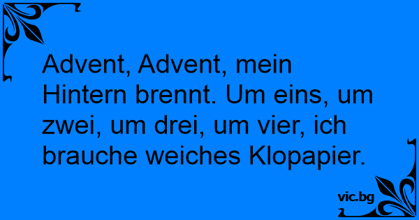 Advent, Advent, mein Hintern brennt. Um eins, um zwei, um drei, um vier, ich brauche weiches Klopapier.