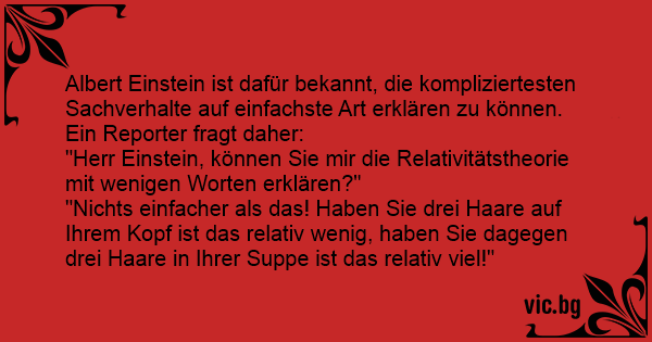 Albert Einstein ist dafür bekannt, die kompliziertesten Sachverhalte auf einfachste Art erklären zu können. Ein Reporter fragt daher: