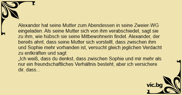 Alexander hat seine Mutter zum Abendessen in seine Zweier-WG eingeladen. Als seine Mutter sich von ihm verabschiedet, sagt sie zu ihm, wie hübsch sie seine Mitbewohnerin findet. Alexander, der bereits ahnt, dass seine Mutter sich vorstellt, dass zwischen ihm und Sophie mehr vorhanden ist, versucht gleich jeglichen Verdacht zu entkräften und sagt: