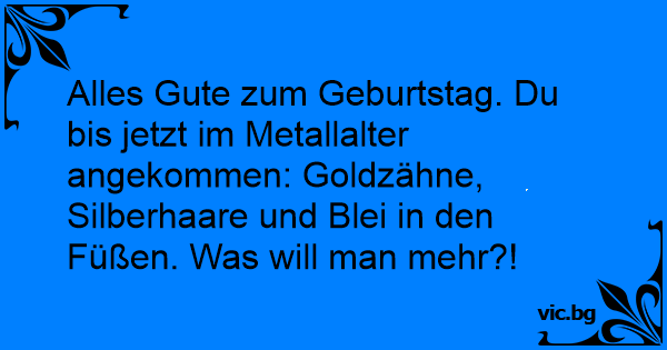 Alles Gute zum Geburtstag. Du bis jetzt im Metallalter angekommen: Goldzähne, Silberhaare und Blei in den Füßen. Was will man mehr?!