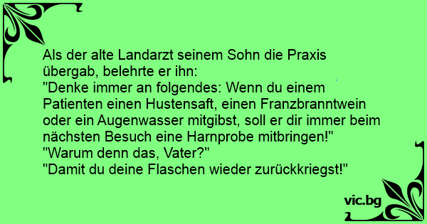 "Denke immer an folgendes: Wenn du einem Patienten einen Hustensaft, einen Franzbranntwein oder ein Augenwasser mitgibst, soll er dir immer beim nächsten Besuch eine Harnprobe mitbringen!"