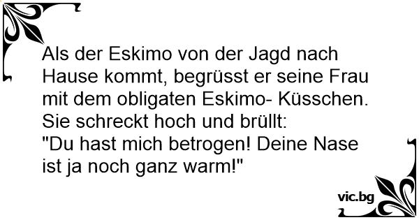 Als der Eskimo von der Jagd nach Hause kommt, begrüsst er seine Frau mit dem obligaten Eskimo- Küsschen. Sie schreckt hoch und brüllt:
