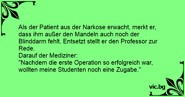 Als der Patient aus der Narkose erwacht, merkt er, dass ihm außer den Mandeln auch noch der Blinddarm fehlt. Entsetzt stellt er den Professor zur Rede.