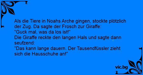 Als die Tiere in Noahs Arche gingen, stockte plötzlich der Zug. Da sagte der Frosch zur Giraffe: