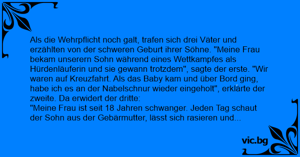 Als die Wehrpflicht noch galt, trafen sich drei Väter und erzählten von der schweren Geburt ihrer Söhne. "Meine Frau bekam unserern Sohn während eines Wettkampfes als Hürdenläuferin und sie gewann trotzdem", sagte der erste. "Wir waren auf Kreuzfahrt. Als das Baby kam und über Bord ging, habe ich es an der Nabelschnur wieder eingeholt", erklärte der zweite. Da erwidert der dritte: