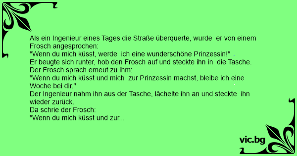 Un ingegnere sta attraversando la strada, quando una rana lo chiama e gli dice: "Se tu mi baci, io mi trasformerò in una magnifica principessa". Lui si abbassa, raccoglie la rana e la mette in tasca. Allora la rana gli dice: "Se tu mi baci, io mi trasformerò in una magnifica principessa e resterò...