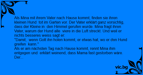 Als Mina mit ihrem Vater nach Hause kommt, finden sie ihren kleinen Hund tot im Garten vor. Der Vater erklärt ganz vorsichtig, dass der Kleine in den Himmel gerufen wurde. Mina fragt ihren Vater, warum der Hund alle viere in die Luft streckt. Und weil er nichts besseres weiss sagt er: