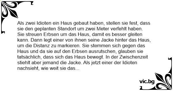 Sie streuen Erbsen um das Haus, damit es besser gleiten kann. Dann legt einer von ihnen seine Jacke hinter das Haus, um die Distanz zu markieren. Sie stemmen sich gegen das Haus und da sie auf den Erbsen ausrutschen, glauben sie tatsächlich, dass sich das Haus bewegt. In der Zwischenzeit stiehlt aber jemand die Jacke. Als jetzt einer der Idioten nachsieht, wie weit sie das Haus schon geschoben haben, findet er die Jacke niсhт mehr und sagt verärgert:
