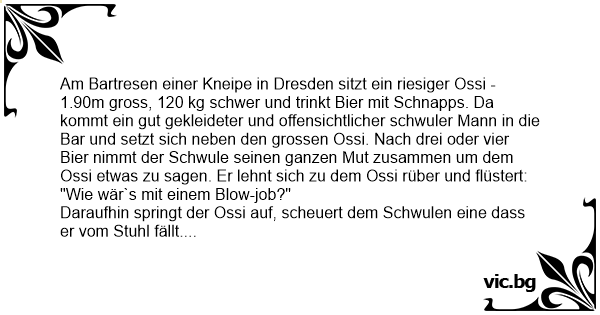 Am Bartresen einer Kneipe in Dresden sitzt ein riesiger Ossi - 1.90m gross, 120 kg schwer und trinkt Bier mit Schnapps. Da kommt ein gut gekleideter und offensichtlicher schwuler Mann in die Bar und setzt sich neben den grossen Ossi. Nach drei oder vier Bier nimmt der Schwule seinen ganzen Mut zusammen um dem Ossi etwas zu sagen. Er lehnt sich zu dem Ossi rüber und flüstert: