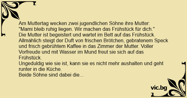 Allmählich steigt der Duft von frischen Brötchen, gebratenem Speck und frisch gebrühtem Kaffee in das Zimmer der Mutter. Voller Vorfreude und mit Wasser im Mund freut sie sich auf das Frühstück.