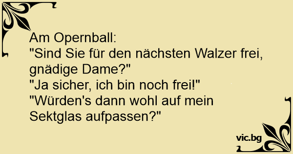 Er: "Entschuldigung, sind sie schon für den nächsten Tanz vergeben?" Sie erwartungsvoll: "Aber nein! Ich bin noch frei!" Er: "Könnten sie dann bitte mein Bier halten?"