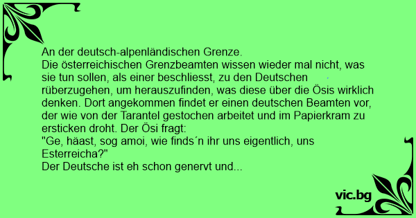 Der Deutsche ist eh schon genervt und zeigt dem Ösi nur den Stinkefinger, ohne ihn überhaupt anzusehen. Der Ösi kommt zu seinen Kollegen zurück und erzählt vom Ergebnis seiner Umfrage: