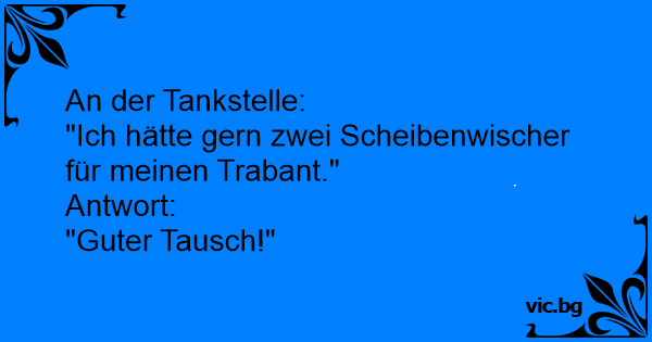Ein Trabbi-Besitzer an der Tankstelle zum Tankwart: "Für meinen Trabbi hätte ich gerne zwei Scheibenwischer." Darauf der Tankwart: "Das ist okay, das finde ich einen fairen Tausch!"