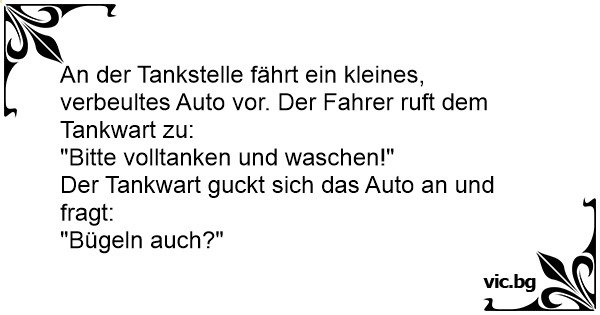 An der Tankstelle fährt ein kleines, verbeultes Auto vor. Der Fahrer ruft dem Tankwart zu: