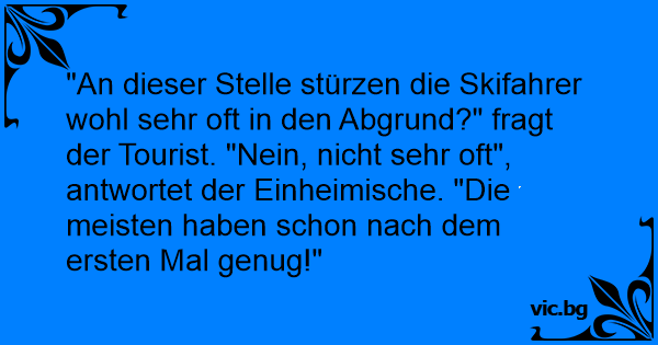 "An dieser Stelle stürzen die Skifahrer wohl sehr oft in den Abgrund?" fragt der Tourist. "Nein, niсhт sehr oft", antwortet der Einheimische. "Die meisten haben schon nach dem ersten Mal genug!"