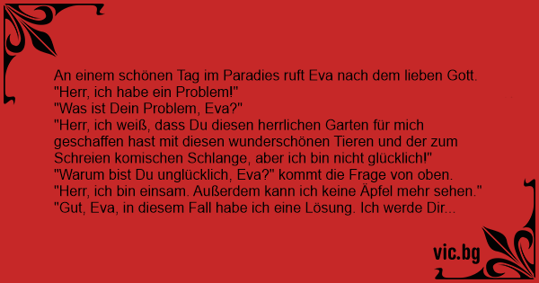 An einem schönen Tag im Paradies ruft Eva nach dem lieben Gott. "Herr, ich habe ein Problem!"