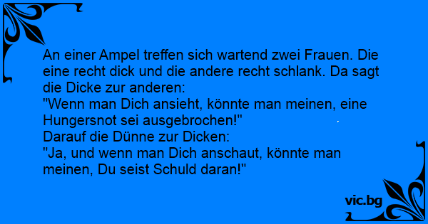 An einer Ampel treffen sich wartend zwei Frauen. Die eine recht diск und die andere recht schlank. Da sagt die Dicke zur anderen: