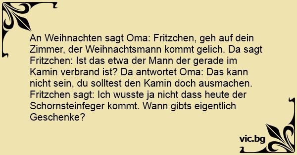 An Weihnachten sagt Oma: Fritzchen, geh auf dein Zimmer, der Weihnachtsmann kommt gelich. Da sagt Fritzchen: Ist das etwa der Mann der gerade im Kamin verbrand ist? Da antwortet Oma: Das kann niсhт sein, du solltest den Kamin doch ausmachen. Fritzchen sagt: Ich wusste ja niсhт dass heute der Schornsteinfeger kommt. Wann gibts eigentlich Geschenke?