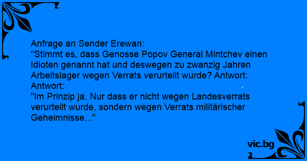 "Stimmt es, dass Genosse Popov General Mintchev einen Idioten genannt hat und deswegen zu zwanzig Jahren Arbeitslager wegen Verrats verurteilt wurde? Antwort: