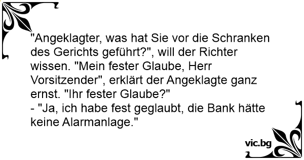"Angeklagter, was hat Sie vor die Schranken des Gerichts geführt?", will der Richter wissen. "Mein fester Glaube, Herr Vorsitzender", erklärt der Angeklagte ganz ernst. "Ihr fester Glaube?"
