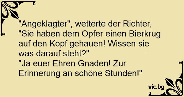"Angeklagter", wetterte der Richter, "Sie haben dem Opfer einen Bierkrug auf den Kopf gehauen! Wissen sie was darauf steht?"