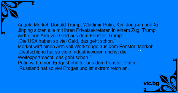 Angela Merkel, Donald Trump, Wladimir Putin, Kim Jong-un und Xi Jinping sitzen alle mit ihren Privatsekretären in einem Zug. Trump wirft einen Arm voll Geld aus dem Fenster. Trump: