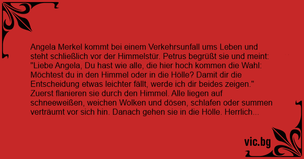 Angela Merkel kommt bei einem Verkehrsunfall ums Leben und steht schließlich vor der Himmelstür. Petrus begrüßt sie und meint: